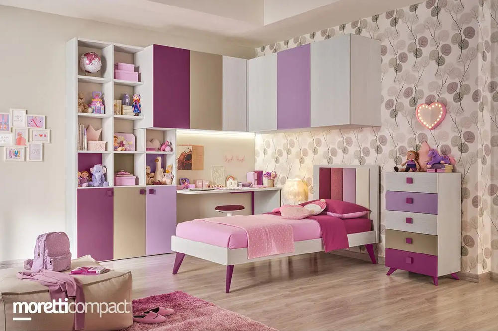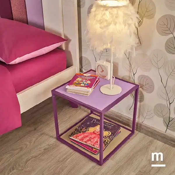 Прикроватная тумба Cage с лакированной столешницей сиреневого и орехового цвета добавляет детской изысканности и современности.